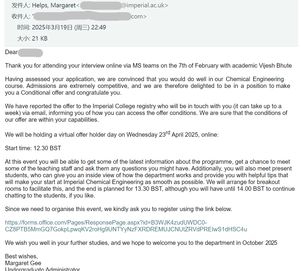 弘波同学凭借优异的学术成绩、竞赛成果和在国内顶尖高校实验室参与科研活动的扎扎实实的收获获得帝国理工的青睐,在学术和面试多个方面过关斩将,一举斩获化学工程专业录取。