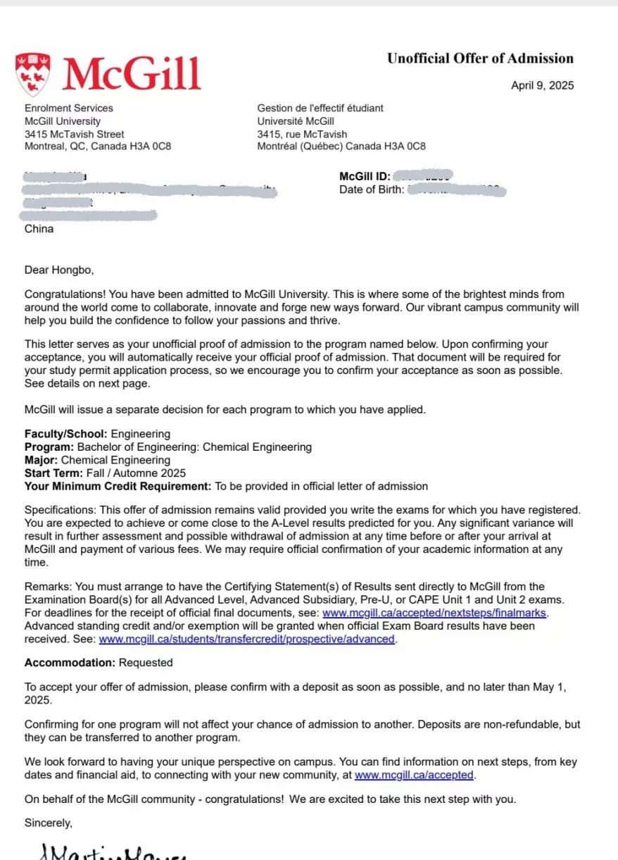 申请尾声阶段,PCIC同学们再接再厉,以又一枚UCL(世界排名第9位)和麦吉尔大学(世界排名第29位)等名校录取收官。